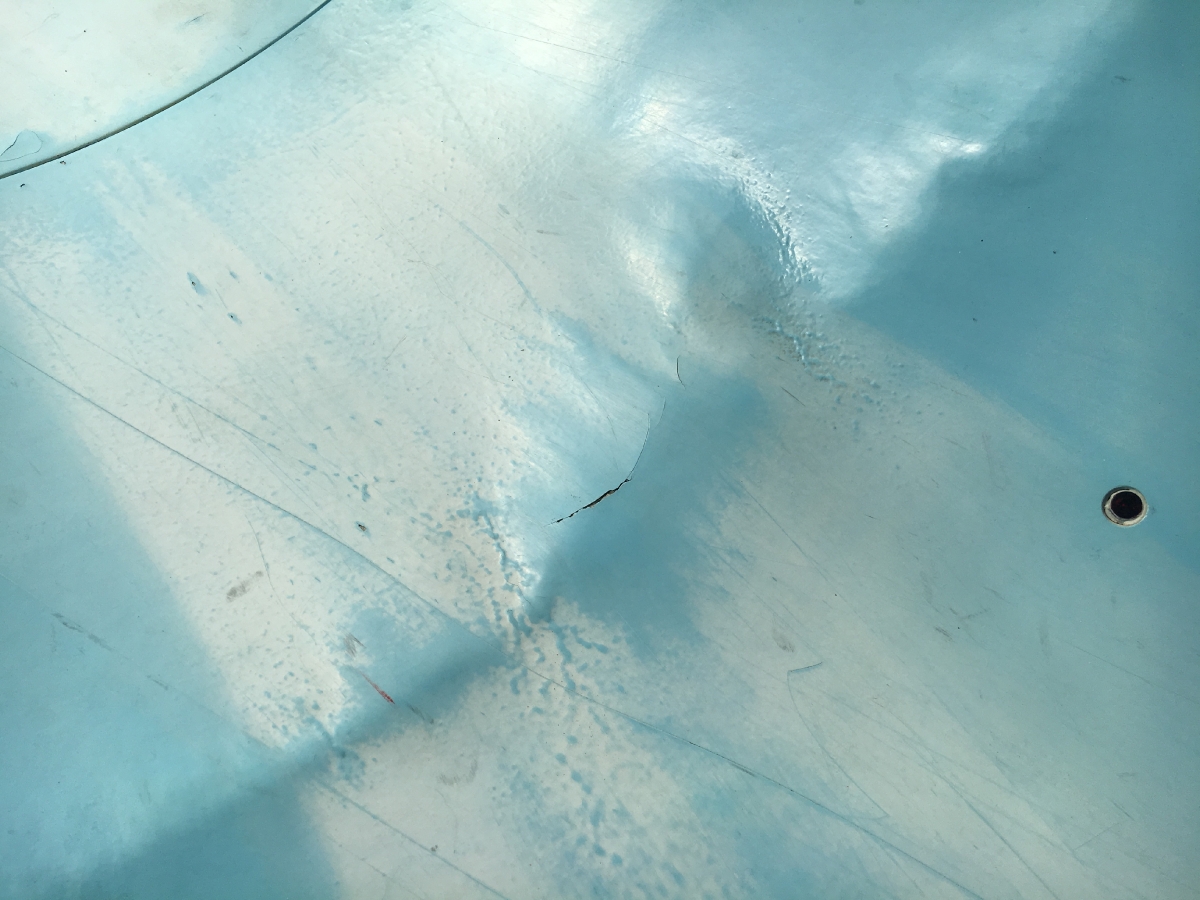 PĘKNIĘCIA PAJĘCZYNOWATE (GWIAŹDZISTE) Powstają w skutek uszkodzeń mechanicznych (także na etapie montażu zjeżdżalni) oraz miejscowej zbyt cienkiej warstwy rusztowania / zbrojenia maty szklanej na etapie produkcji. Mogą mieć wielkość od kliku do kilkudziesięciu centymetrów. Nie wykryte w porę stale się powiększają otwierając odnogi pęknięcia które stają się bardzo ostre.